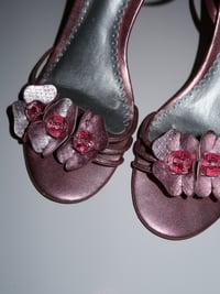 DETAILS: Pink metallic leather with floral details + pink beads. Features an ankle strap. Original heel intact.
