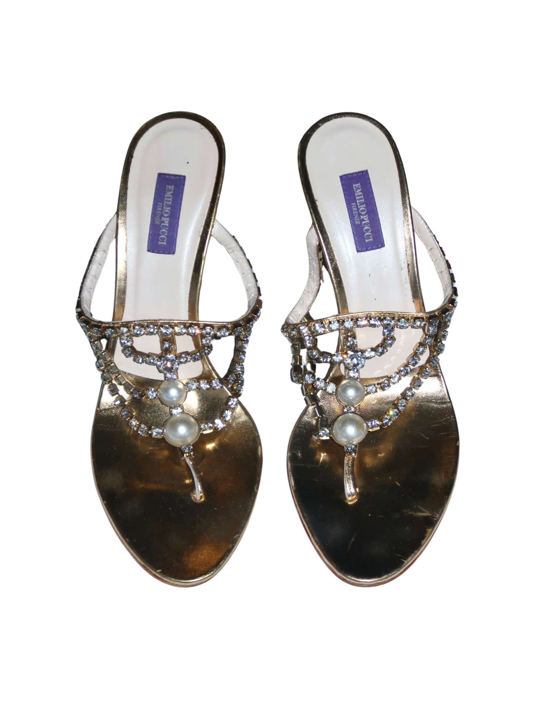 *RARE* Emilio Pucci Gold Pearl + Rhinestone Thong Heel Sandals - EU 38.5
